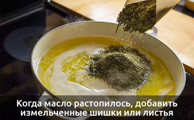 Когда в кастрюле или сковороде образуется однородная жидкая масса, в нее добавляются подготовленные измельченные шишки или листья каннабиса.