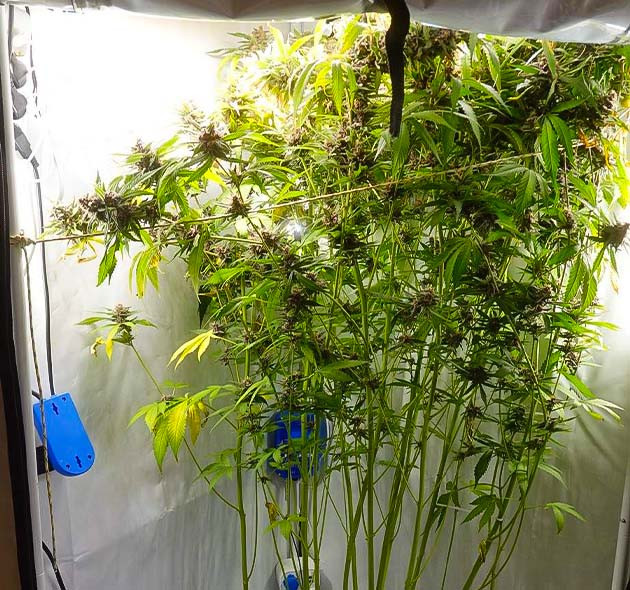 Ну что ж, я немного ошарашен, так как куст вытянулся настолько сильно, что на моей памяти такого еще не было. Всего за неделю он прибавил почти 50 сантиметров! Его рост 140 см. Поменял лампы на борд 240 Вт. Учитывая размеры куста, решил в каждом углу поставить еще по полосе диодов LM301H для бокового досвета этого монстра. Единственная проблема – макушки уперлись в лампу, что не есть хорошо. Некоторые из них подгорели еще от прошлых светильников, но в общем выглядят нормально. Заменил раствор в баке, перешел на HydroMax Bloom A и B. Разводил из расчета 2 мл/л каждого компонента. Получился компот 900 ppm. После того как заправил бак новым раствором, провел дефолиацию. Удалял как нижние листья и лопухи из центральной части куста, так и большие листья с макушки, чтобы они не закрывали свет. Обрезал довольно много нижних веточек, которые получали меньше всего света и от которых бы все равно уже не было бы никакого толка. Отмечу очень крепкий ствол и ветви.