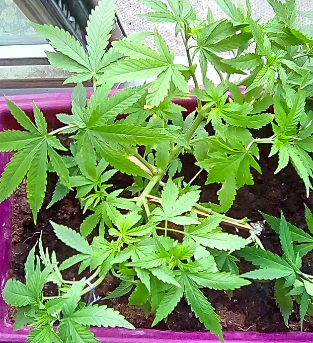 На второй неделе два черенка с самыми развитыми корнями были высажены в горшки объемом один литр. Укоренились они быстро, стояли под «куполами» из пластиковых бутылок. На 4-й день своей самостоятельной жизни я сделал им топпинг и снова накрыл. Саженцы довольно быстро пришли в себя, причем на одном из них сформировалось не два, а три новых стебля, эдакий Змей Горыныч. Ну что ж, так еще интересней. К концу недели их высота была плюс-минус 10 сантиметров. Лампа опущена достаточно близко к горшкам, на 25 сантиметров. Свет включен 20 часов в сутки.
