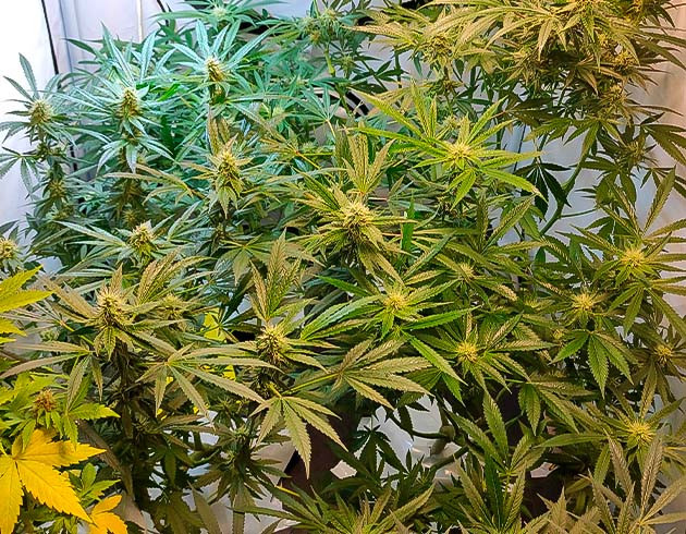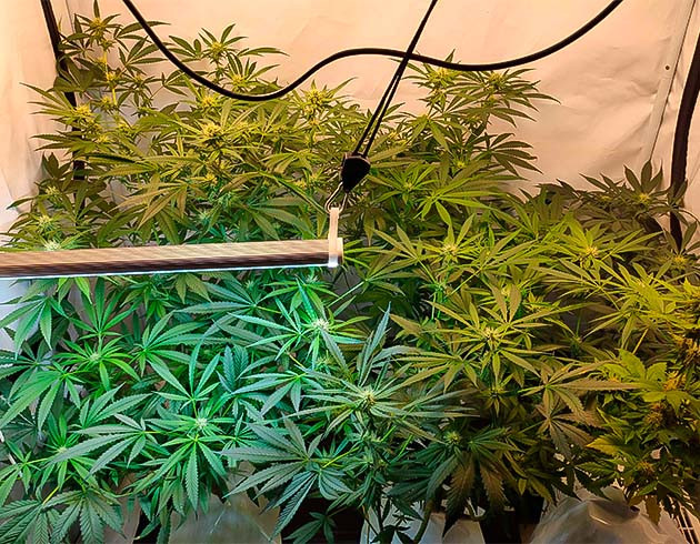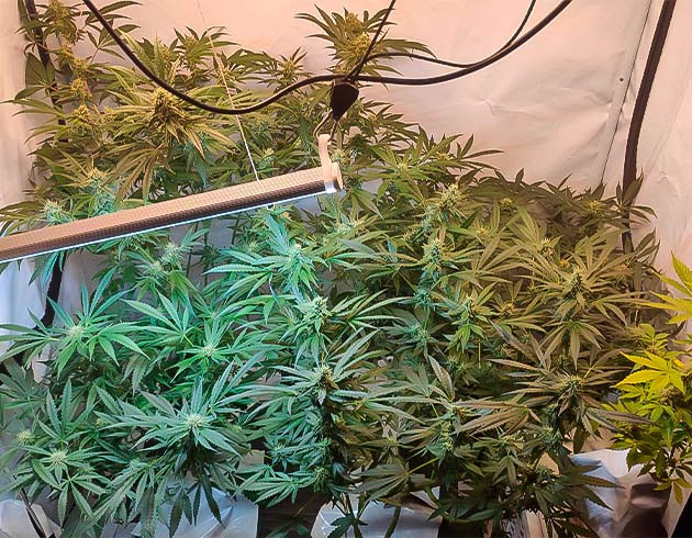 Сразу после перехода в фазу цветения кусты показали невероятно активный рост. За две недели они вытянулись до 40 сантиметров, а вширь заполонили все пространство гроутента. Я слегка снизил уровень влажности, до 60 %. Также я использовал методику LST, на которую каждый куст отреагировал прекрасно.