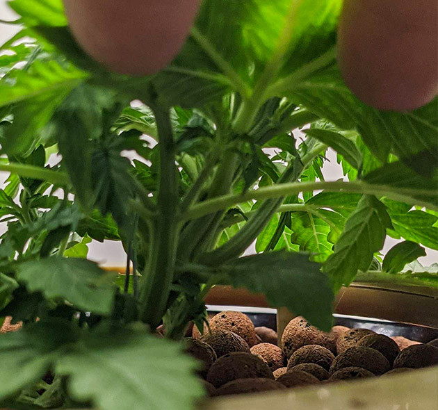 Долго ждать не пришлось. Саженец быстро проклюнулся и сбросил каску. Однако из-за форс-мажорных обстоятельств я столкнулся сразу с двумя проблемами. Во-первых, из-за плохо откалиброванного pH-метра “Горилла” получила первый полив с pH 6,8-8. Но более значимой проблемой была поломка LED-панели, в результате чего растение три дня стояло на балконе при довольно пасмурной погоде. Из-за этого оно немного мутировало, и после семядоли сформировался всего один листик. Лампу удалось починить довольно быстро, и саженец переехал обратно в гроутент, где шустро начал формировать второй этаж, а за ним и третий. Так как гров проходит в кокосе, то после первых двух поливов я сразу начал подкормку, и в дальнейшем куст будет получать питательные вещества с каждым поливом, то есть ежедневно по два раза. Концентрация раствора такая: