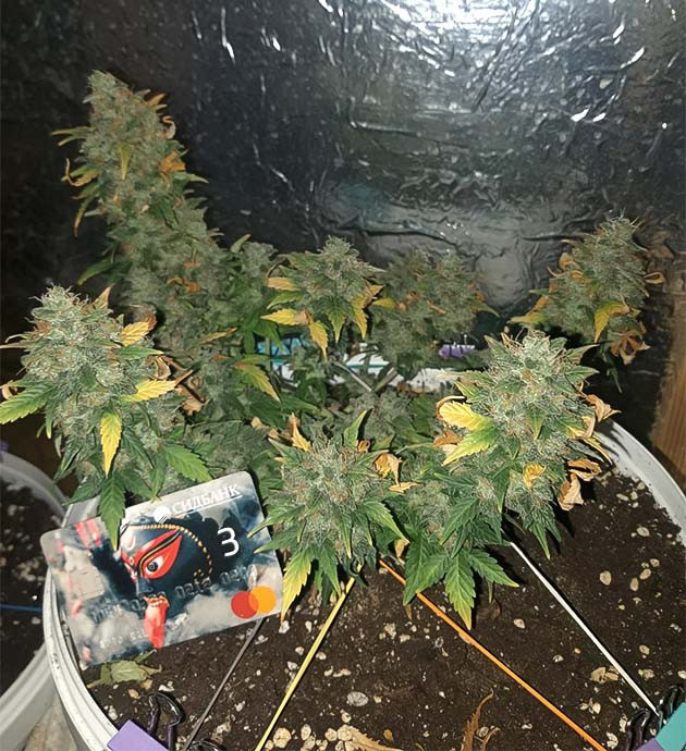 Kali Mist Auto от «Семяныча» – это самый быстрый автоцвет, который мне доводилось выращивать. По скорости созревания он обошёл все другие сорта, с которыми я знаком. Единственное, на что я могу списать созревание от семки до урожая за 64 полных дня, – это предельно компактный размер куста. Возможно, я немного перестарался с LST и не дал ему вытянуться на предцвете, из-за чего длины ветвей не было достаточно, чтобы сформировать больше соцветий. Никаких проблем по ходу грова, минимум удобрений под корень плюс периодическая обработка по листу. В итоге получился очень компактный и невысокий кустик. С него я собрал 52 грамма отманикюренных шишек, которые я отправил на сушку и пролечку, предварительно отщипнув небольшой кусочек для экспресс-сушки и дегустации. Отдельно отмечу невероятно сильный аромат, который стоял по ходу грова растения, но особенно во время уборки урожая и его последующей обработки. Было ощущение, что этот запах услышат вообще все на свете. Аромат очень фруктовый, я бы сказал, с выраженным мотивом спелого манго.