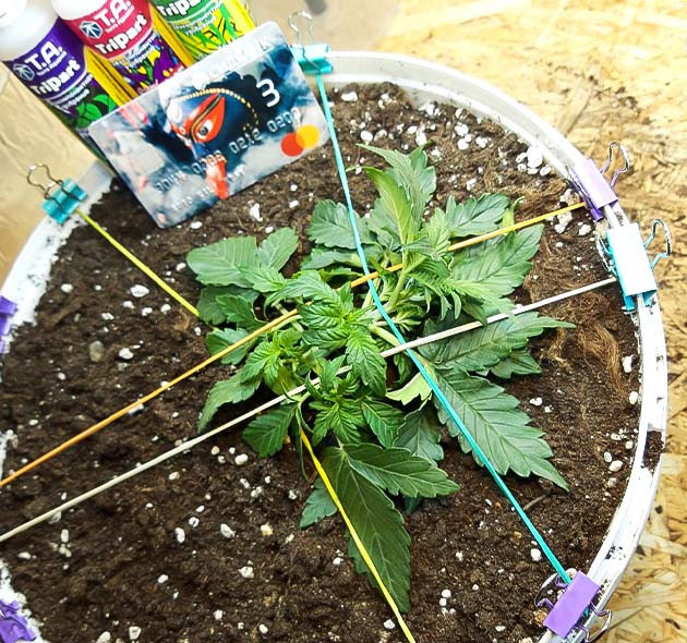 Растение развивается очень хорошо, быстрее, чем я ожидал. Пожалуй, это самый бодрый автоцвет на моем опыте. К 13-му дню уже разрослись боковые побеги, поэтому начал гнуть растишку по методике LST. До этого специально не поливал кустик 2 дня, чтобы он лучше гнулся, и я не повредил молодые стебли. Использую обычные резинки, в принципе, на фото всё отлично видно. Таким образом мне удаётся сформировать невысокие кустики, на которых сформируется много бутонов за счет развития боковых ветвей. После того как согнул малышку, дал по листу «Эпин» от Буйских, чтобы минимизировать стресс. На следующий день дал полдозы удобрений GHE (дозировка по инструкции).