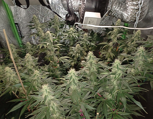 Девятая неделя, перевод в цвет, то есть смена светового режима на 12/12. К этому моменту рост куста по самой высокой коле – 66 сантиметров. Остальные плюс-минус той же длины. На 57-й день полив с удобрениями, Tiger Bloom 2,6 мл/л и Mammoth P 0,2 мл/л. Следующий полив на 59-й день с «КалМагом» и Mammoth P, без «Блума». На 61-й день полив с «Блумом» и через два дня еще один, но уже без «Блума». Получилось 4 полноценных полива за неделю. На 62-й день я заметил, что воздух в палатке очень спертый, а влажность невероятно подскочила. Причина была в забитом предфильтре, из-за чего кустик практически не получал свежего воздуха. Почистил, и всё встало на свои места.