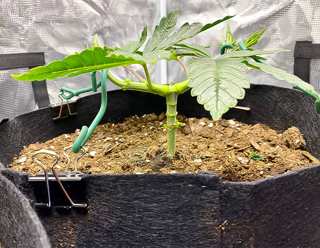 Второй росток, к сожалению, погиб. Считаю, что все-таки проблема заключалась в излишке питательных веществ. Поэтому для перестраховки я еще раз пересадил первый росток в еще больший горшок. Помимо этого, я подрезал верхушку, а также прибегнул к реализации техники мейн лининга. Высота растишки на данном этапе составляла 16 сантиметров.