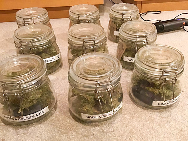Разделил куст на несколько больших веток, частично проманикюрил, удалив в основном только лопухи, и развесил сушиться. До оптимального состояния перед пролечкой они высохли за 8 дней при темпе в 25 °C, влажности 50 % и постоянно работающем обдуве. После этого тщательный маникюр, шишки в одну сторону, трим – в другую. Итоговое количество бошек, которые отправились лечиться, – 102 грамма. Плюс нехило так трима, но его я вешать не стал.