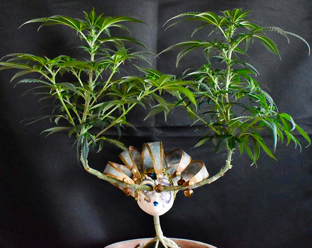 Надеваем маску на Grandmommy Purple. Прошло еще две недели, прежде чем растение было готово к следующему этапу тренировок. Я сделал топпинг и обрезал всю листву и узлы роста, кроме двух верхних. Над обрезанным кустиком я установил венецианскую карнавальную маску, теперь у двух макушек есть только один путь развития – через отверстия для глаз в маске.