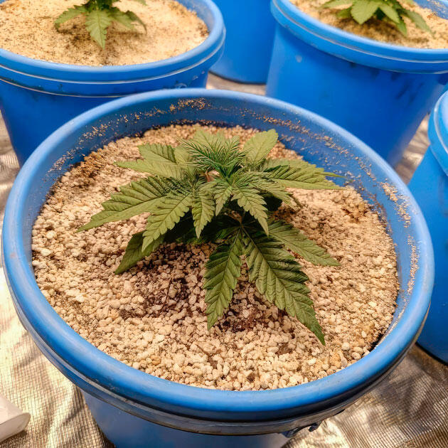 Провел уборку в боксе после харвеста, подготовил все необходимое, заполнил ведра смесью почвы и перлита в пропорции 2 к 1, воткнул в центр кубики RootRiot с предварительно запихнутыми внутрь семенами, а потом хорошенько пролил водой с добавлением микоризы, Microbes, Bio Heaven и Root Juice от BioBizz. Из-за обильного полива часть перлита всплыла, и кажется, что почвы там нет вообще. Но поверьте мне, друзья, она там есть.
