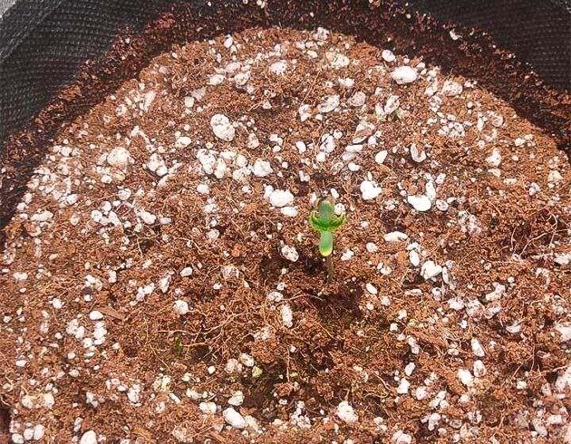 Сутки семка провела в стакане с водой, после чего показала корни и была перемещена в пятилитровый горшок с кокосом для дальнейшего прорастания. Спустя три дня каска была сброшена и начат отсчет грова. Свет на время периода рассады включен в режиме 24/0. Микроклимат в норме. Температура стабильно 24-25 градусов, влажность около 70 %. Полив легким питательным раствором с 1,5 мл/л Alpha NPK.