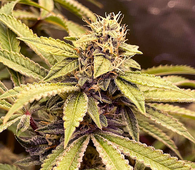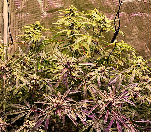 Учитывая обожженные удобрениями части куста, я начал постепенно удалять все больше и больше листвы. Таким образом, растение направит свой финальный рывок на соцветия, да и работать с кустом на харвесте будет проще. Хочу отметить, что в палатке не слишком сильный запах, несмотря на монструозный вид растения и огромное количество бутонов. Куст очень интересного цвета, фиолетово-красно-розового. Такого изменения цвета можно добиться не только ожогом удобрениями, но и значительными перепадами температур. Напомню, разница между днем и ночью составляет 12 градусов. С 20-й недели куст начал также получать Stimulator Super Boost PK в количестве 1 мл/л.