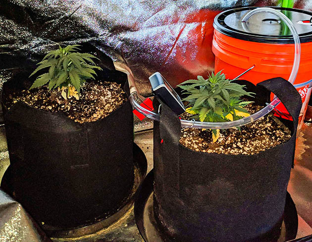 В начале третьей недели я пересадил подросшие кустики в двадцатилитровые гроубэги, и им предстояло целую неделю стоять без моего присмотра. Вернее, было так. Я отправился в отпуск, но перед этим соорудил систему автополива. Я смастерил такую конструкцию: большое ведро + трубки к каждому горшку + помпа, подключенная к умной розетке, которой я могу управлять с телефона через приложение. В боксе поставил веб-камеру, которая была направлена на растишки.