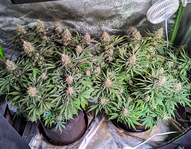 После перевода в цветение растихи получили подкормку из G.O. Thrive Grow, CaMg+ и G.O. Bud (1,32/0,66/1,25 мл/л). На кустах было достаточно много желтых и больных листов, преимущественно в нижних частях растений. Я обрезал их вместе с небольшими веточками. В целом девочки после дефолиации выглядят нормально, будто полностью оклемались от проблем.
