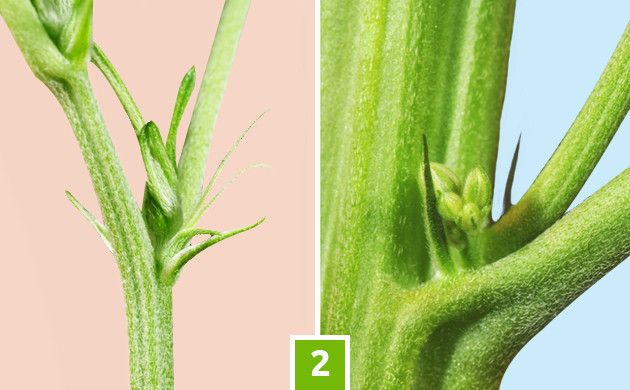 Есть несколько внешних отличий самих растений, по которым можно различить мужской и женский куст еще до начала стадии цветения марихуаны. Мужские кусты в целом немного выше, чем женские. Таким образом, с большей высоты им проще рассеивать пыльцу на женские особи. Для гровера они могут создавать дополнительную проблему: затенять женские растения. Если заметите среди посадки, что один куст развивается стремительнее других, наблюдать за ним стоит крайне внимательно. Вот еще ряд визуальных отличий: