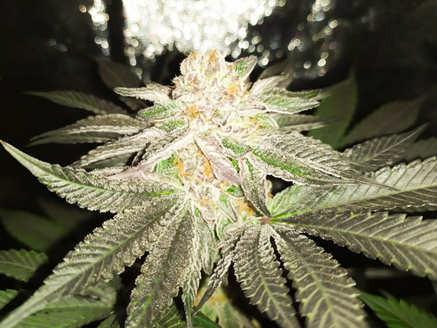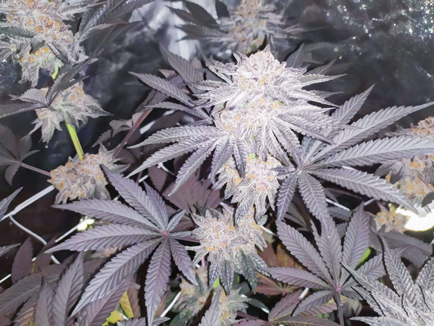 К 11-й неделе большая часть куста была фиолетовой, зеленого цвета осталось минимум. Запах стал резким и насыщенным. Надеялся, что он будет не таким интенсивным, так как уголь в фильтре давно пора менять и он откровенно не справляется. Поэтому в комнате стоит подозрительный запах, но, кроме моей кошки, он никого не волнует. Но всё же лучше с такими моментами не шутить и заботиться о своей безопасности. Куст выглядит достаточно зрелым, но по трихомам резать его еще не пора. Янтаря нет совсем, а для индики его должно быть хотя бы половина.