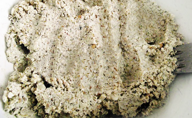 Тофу протирается через сито и смешивается с конопляным семенем, овсянкой и специями.