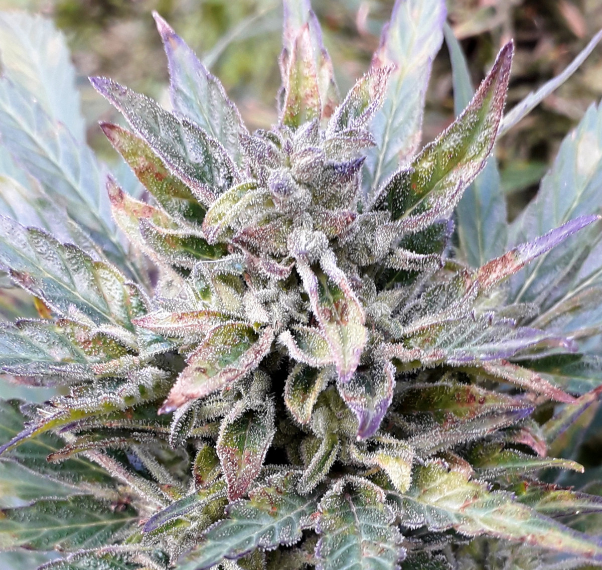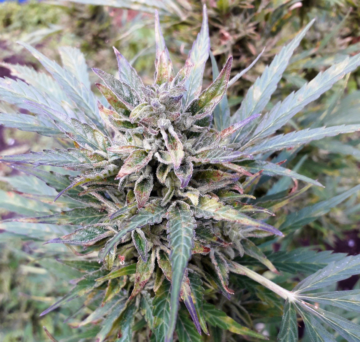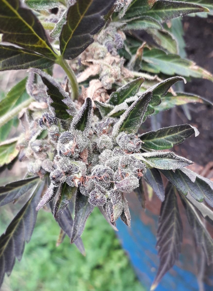 - Общие впечатленияТе гроверы, кто живёт на югах, на 45-47 широте, многие думают, что автики везде быстро растут...но они ошибаются...Конкретно по этому сорту, чтобы полностью вызреть, до конца в ауте, до фиолетовых или пурпурных шишек (в описании не врут про это), на 53 широте потребуется 4,5-5 месяцев...это уже проверено и не раз ( ПИШУ ПРО СРОКИ СОЗРЕВАНИЯ СПЕЦИАЛЬНО ДЛЯ НЕТЕРПЕЛИВЫХ ГРОВЕРОВ АУТА, КТО ЖИВЁТ НА 50-55 широтах, И ЧАСТО, ОБЫЧНО СРЕЗАЮТ И КУРЯТ НЕЗРЕЛЫЕ, НА ПОЛОВИНУ НЕ ВЫЗРЕВШИЕ, ЗЕЛЁНЫЕ ШИШКИ, И СЧИТАЮТ,ЧТО ВСЕ АВТИКИ МАКСИМУМ ВЫРАСТАЮТ ЗА ДВА МЕСЯЦА - ЭТО НЕ ТАК!!!). При плохих погодных условиях и на больших широтах, ни один автик в ауте, даже самый скоростной, никогда не сможет вырасти и вызреть за 2-2.5 месяца, как пишут в описаниях сортов, обычно даже самым скоростным автикам на 50х и выше широтах, потребуется минимум 3 месяца, а большинству автиков придётся расти до полного вызревания 4-5 месяцев - запомните это!!!...И про вес тут в описании, пишут про 700 грамм сырого веса в ауте (и здесь тоже нет вранья), при сушке и маникюре будет выходить 150 до максимум 200 грамм сухих бошек, но это только при хорошем уходе....Кто не верит, про фиолетово-пурпурные бошки в конце созревания, скидываю фотки пурпурных бошек скитлеса и его даже не фиолетовых, а почерневших красиво листьев....Только тут фото ещё маленько не дозревшего автика и шишек, окрас на фото не сильно виден - что пурпурные, но это так и есть, уверяю Вас... Да и размеры автика фотки как-то искажают, вживую он выглядит массивнее (это фотка одного скитлес, самого маленького, ещё два других скитлес, растущих просто на земле, а не в бочке, больше этого в размерах раза в полтора).... ещё две недели "Рипена" и харвест...Всем МИР и БОГАТЫХ УРОЖАЕВ!!!